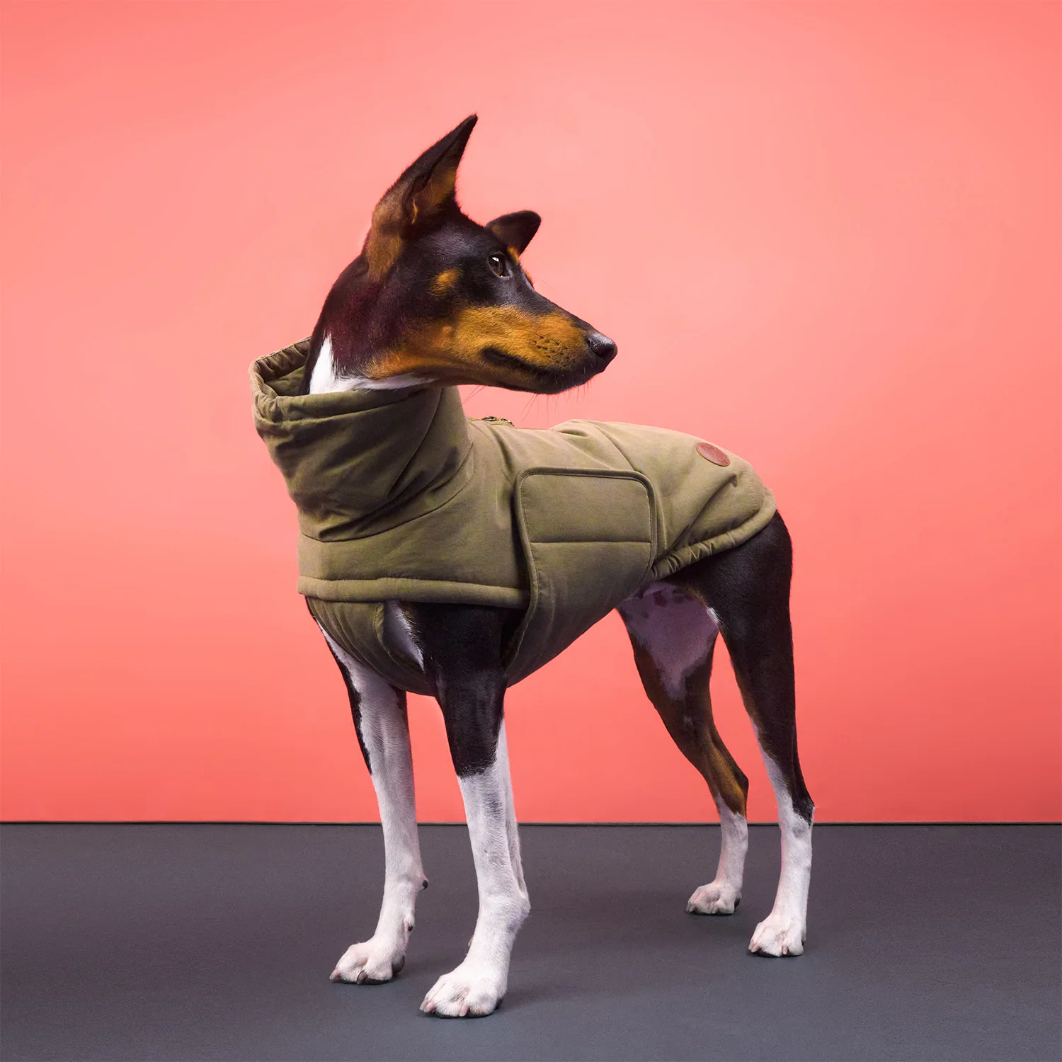 Hundewintermantel im Parka-Stil in Khaki aus robustem Stoff mit kuscheligem Innenfutter.