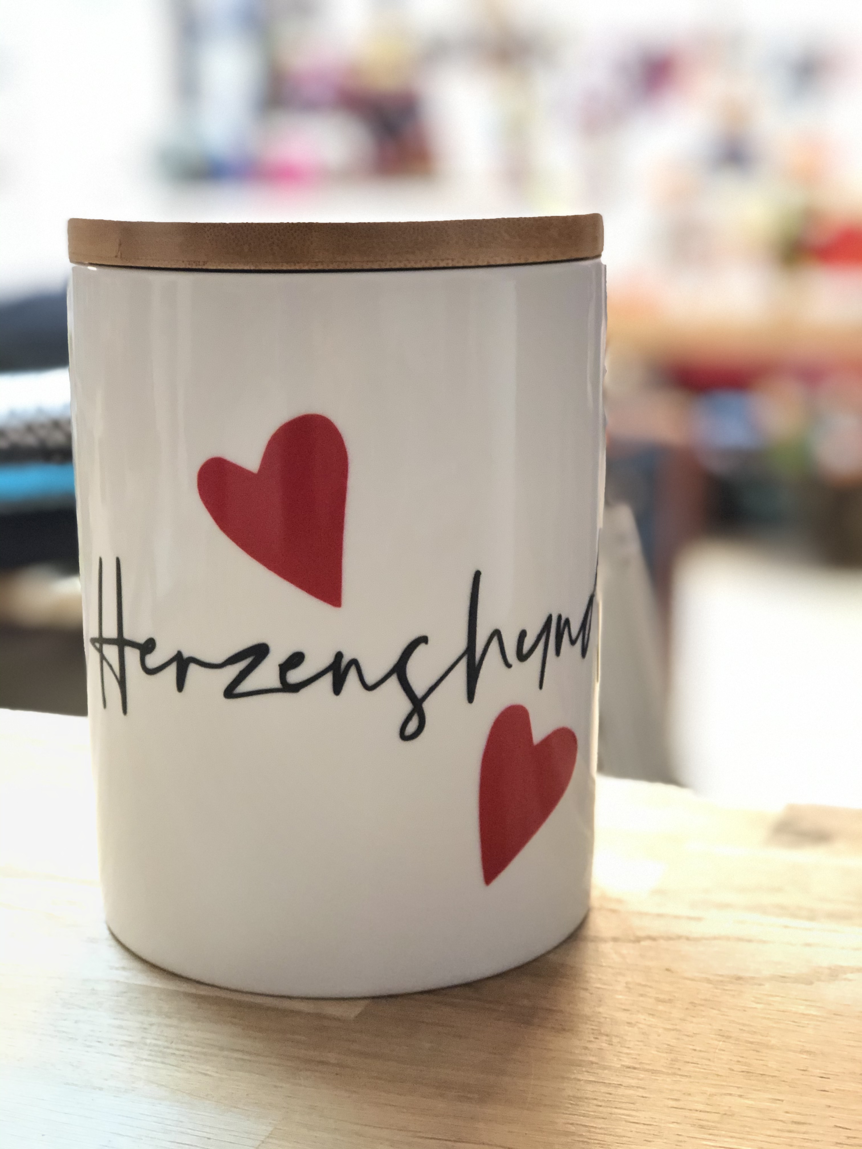 Unsere Dose besteht aus einer schicken Beschriftung auf einer Porzellandose mit Bambusdeckel.